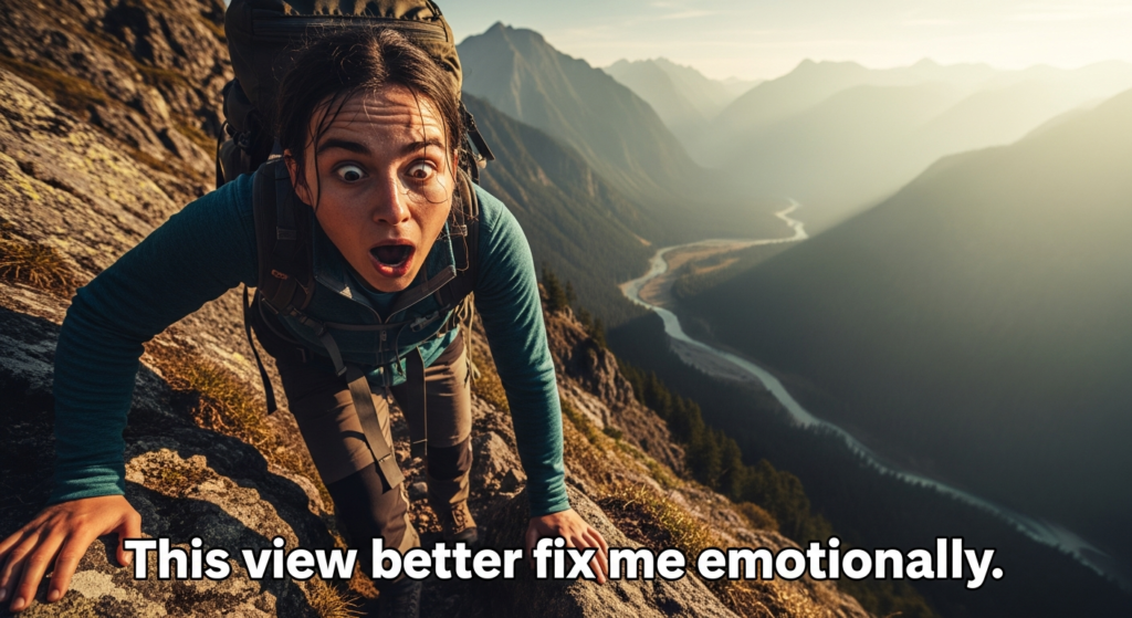 Final sarcasm: Hiking won’t solve your problems. But at least the views make denial scenic.